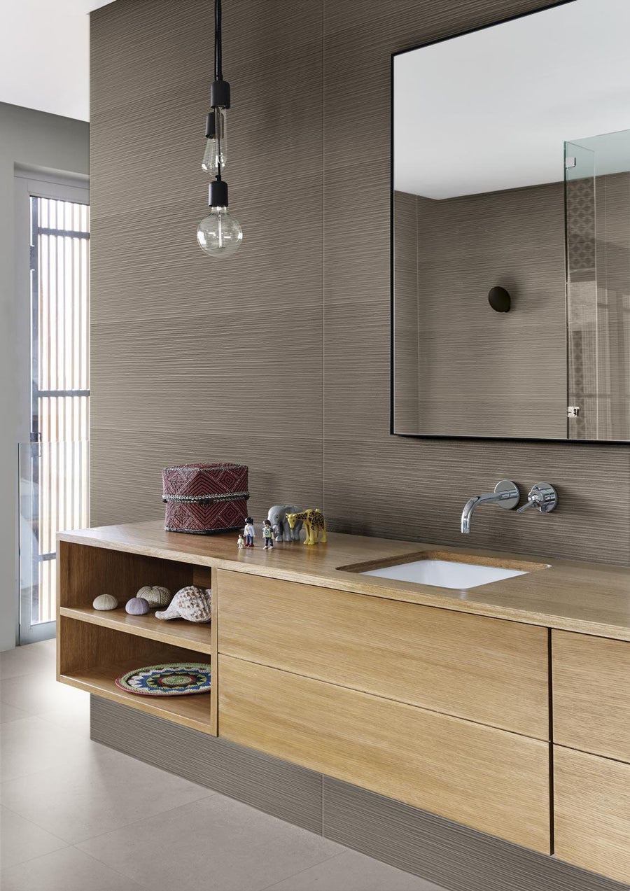 Gresie porțelanată Righe Greige din colecția Realstone_Rain inspirată de o piatră de calcar de origine engleză de la care îsi ia numele, caracterizată printr-o grafică minimă și regulată printr-o umbrire calmă jucată pe tonuri gri, care constitutie adevărata sa bogăție și diversitatea. Cu un finisaj natural și moale, care poate fi amestecat împreună, conform unui nou concept de ”amestecare” care sporește variabilitatea și intensitatea graficelor și a nuanțelor.